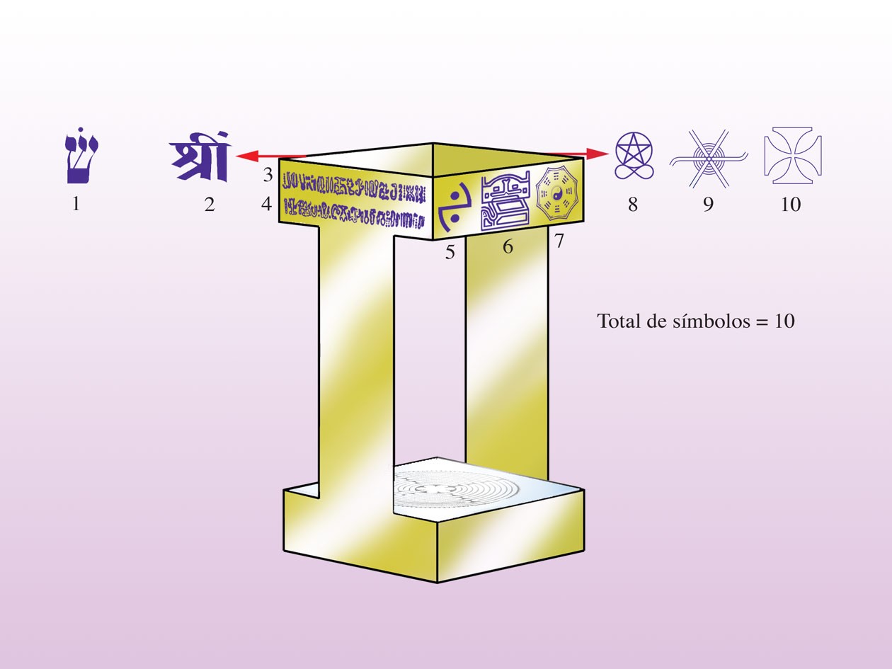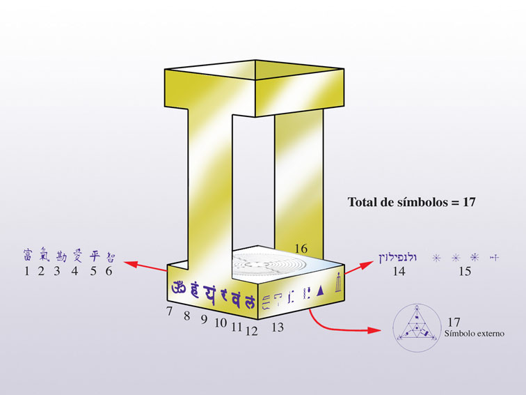 El conjunto piramidal vale, por lo tanto, 1, y ya nos explayamos mucho sobre él anteriormente, por estar siendo representado por el total de símbolos del soporte superior de la base (10 símbolos), por estar en la medida, en la dimensión del ancho del Puntal (98 mm), por representar el primer nombre numerológico PUNTAL (28à10à1) como veremos más adelante… el n° 1, como ya vimos, organiza, transmuta, realínea…