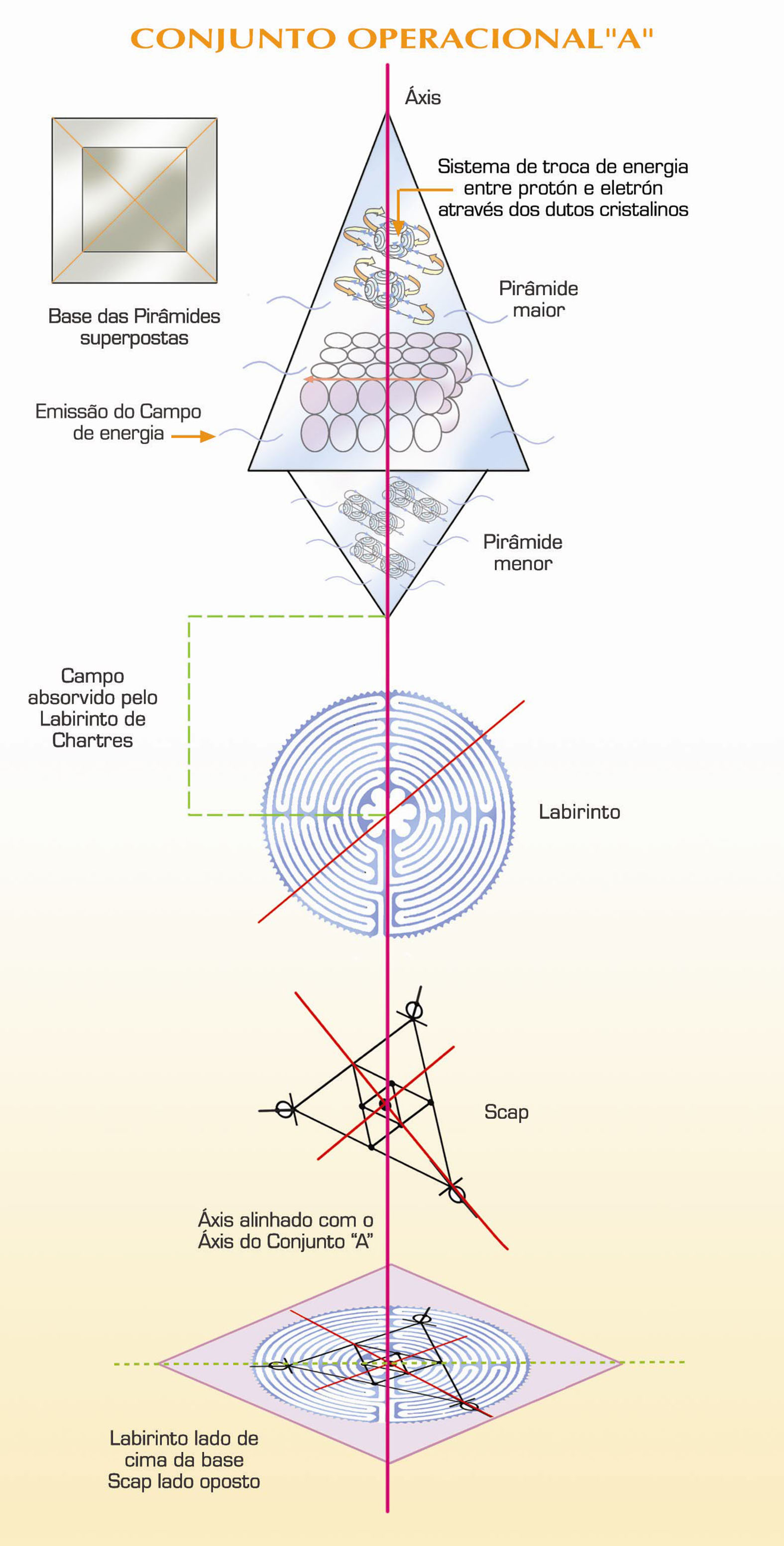 La pirámide inferior (invertida) es el dosificador de esta energía electromagnética y electroprotónica, conforme ya se dijo más arriba. En conjunto, el receptor, el dosificador y el disipador, tienen como objetivo mantener estable y en equilibrio todo sistema de transmutación frecuencial descrito anteriormente; dicha transmutación de energías harmónicas y sutiles será, entonces, liberada rítmicamente por la pirámide inferior que está invertida, dosando en forma de campo de subpartículas atómicas las ondas que se llegaran a producir en los túneles de los vértices cristalinos que están en los ejes moleculares cristalinos, los que, conforme lo descrito más arriba, son previamente procesados por el cristal mayor de la pirámide superior; tal liberación interaccionará con todo el aparato alcanzando los símbolos radiónicos y encaminando el campo sutil para la bobina (Laberinto de Chartres) siendo, entonces, filtrado por el Scap y disipado por el actual momentun físico o extrafísico.