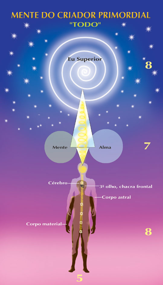 Essence de l’esprit du créateur primordial avec le moi supérieur entourant l’ esprit et l’âme, apportée au corps astral et matériel, établissant le code numérologique 8-7-8.