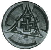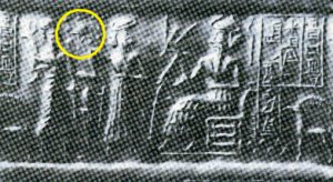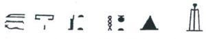 Encontrado no centro do capacete da Estátua Divina conhecida como Divindade da Cabeça Gigante em Tiahuanaco, Peru, ainda indecifrável.
