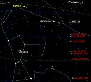 (8s,F2.5,100ASA,zoom equivalent to 103mm in a 35mm camera) with a digital camera revealed something. A second 2s exposure showed more. The coordinates were not exactly the Zeta ones for that date. It seemed advanced in time. On the 22nd of April day I took the picture looked like in the 4th of May coordinates.
